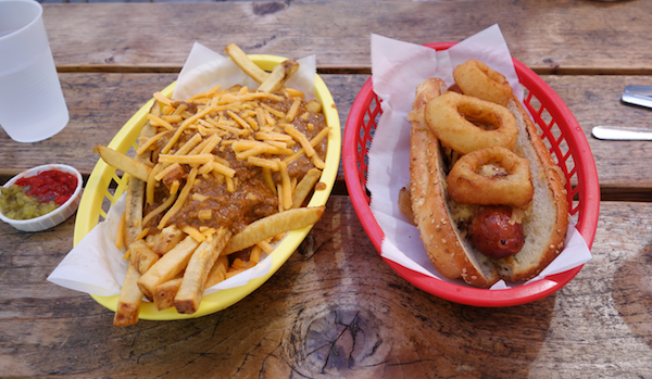 I had to try one but didn’t think I could finish a whole sausage at that point. My husband said he’d split it with me, but at the last minute the idea of splitting a precious bratwurst was so distressing that I had to add on an order of chili cheese fries! I asked the woman working if the chili cheese fries there were good. “Oh they’re great,” she said. “I know this isn’t going to sound great…but they’re nasty…you get what I mean?” Yes I did, and immediately went ahead and ordered them.