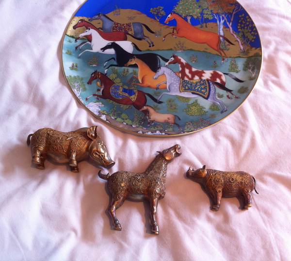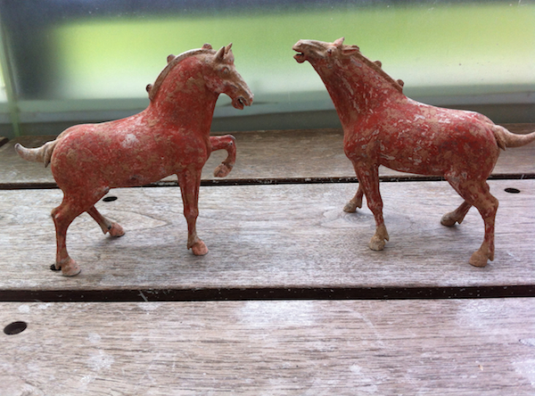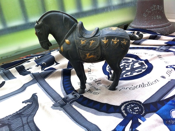 I am lucky enough to have a good friend who is a serious antique collector of Chinese antiques and antique jades. Through him, I’ve been lucky enough to pick up a few small things, for example, my pair of Tang horses from the Tang dynasty, and some bronze/gold animals (purportedly from the Tang dynasty but more likely Sung or Ming). Can you see a horse theme anywhere?