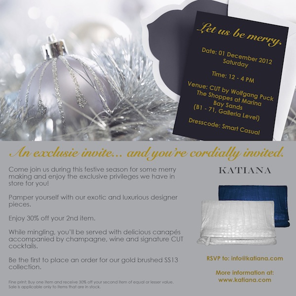Really, how charming are Elsa and Katiana? I loved getting to know more about them (and their beautiful products)! It’s much harder than it may seem to launch an entirely new luxury brand and do it with the fantastic execution and good grace that these two ladies have. They were also both kind enough to invite readers to their Christmas party this coming Saturday at their flagship shop at the Marina Bay Sands in Singapore. If any of you are around and would like to attend, details are in the image above, and please RSVP to info@katiana.com and mention that you are a reader. Thank you Katiana and Elsa for the invite and for sharing some of your lives here with us today!